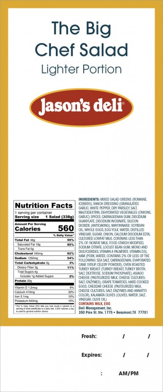 200 g of Chef salad contains 120 mg vitamin C as well as 20000 mg of calcium. 11 rows Chef Salad Serving Size.